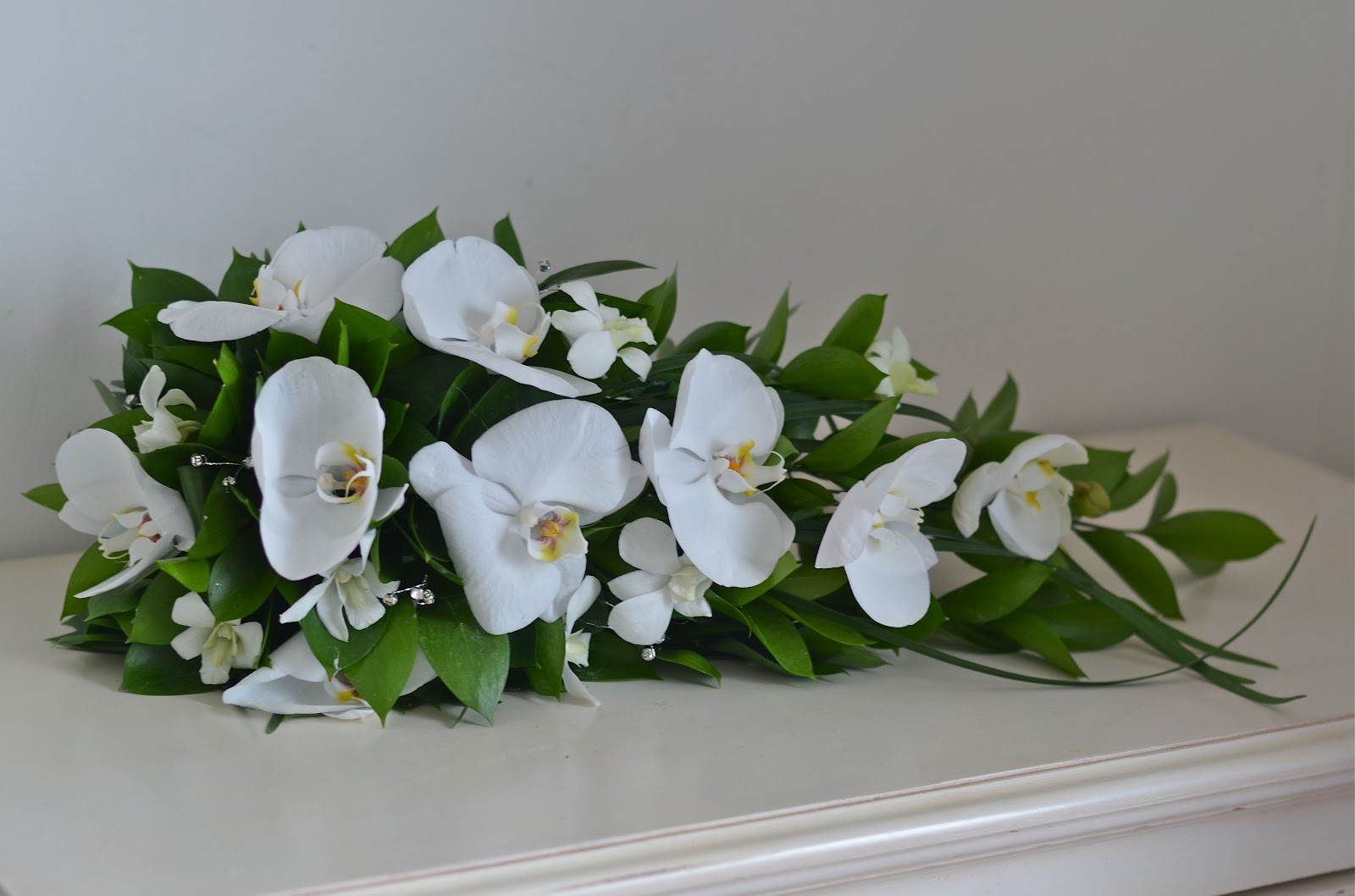 Teardrop bouquet of white orchids with diamante sprays and deep green foliages. I have used both the moth and the singapore orchid here wiring the flowers in to make a beautifully elegant bouquet for Anne